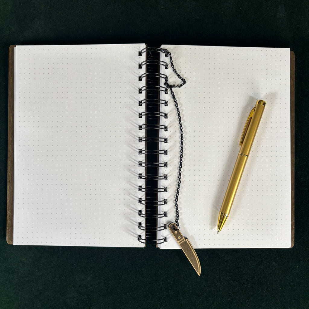 Each journal comes with a detachable chain bookmark featuring a cat-head charm and a tiny knife charm.